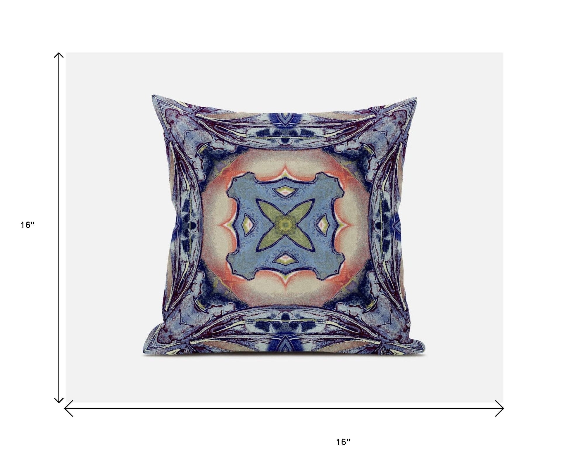 Encapsulate the airy ambiance of the seaside into your home with this Indigo Peach Geo Tribal Suede Throw Pillow that features a traditional print with a boho flair. The pillow has intricate linework on the outermost corners that slowly transition from blues and indigos to a circular motif in peach that allows the pillow to be likened to a piece of art by itself. Crafted from a luxurious suede fabric, the pillow has a premium look and feel while also being very durable. This blown and closed throw pillow features a soft polyfill insert which makes this eco-friendly pillow luxuriously fluffy and super comfortable to support your posture when you lean on it. Curate a carefree ambiance in your home with this beachy boho pillow that pairs perfectly with the modern aesthetic. 16” x 16” x 5”