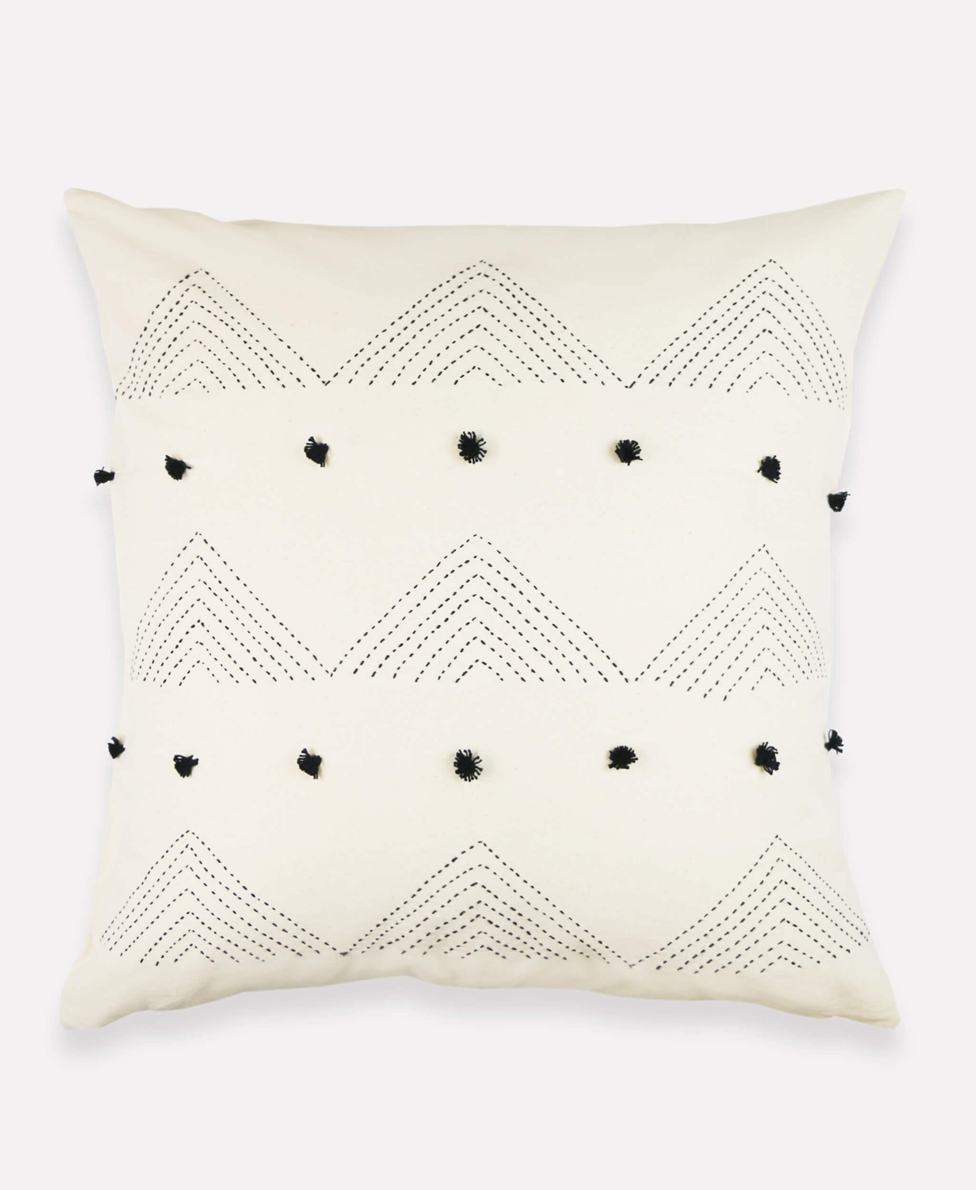 Add a touch of modern, global style to your home decor with this throw pillow. Its charming triangle stitch is enhanced by dynamic rows of playful pom poms. Pair it with other decorative pillows to create a one-of-a-kind mix for a bed or sofa. Made by an artisan in Ajmer, India, this product is Fair Trade Verified and features a hand-stitched signature of the maker.