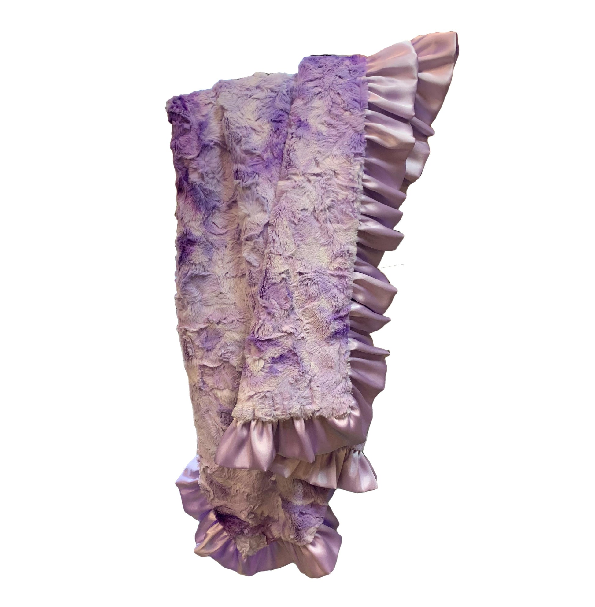 Featuring lilac / amethyst textured, bunny-soft surface w/ a chic frosted diamond embossed design on both sides w/ a coordinating Lilac Silky Satin Ruffle Trim.