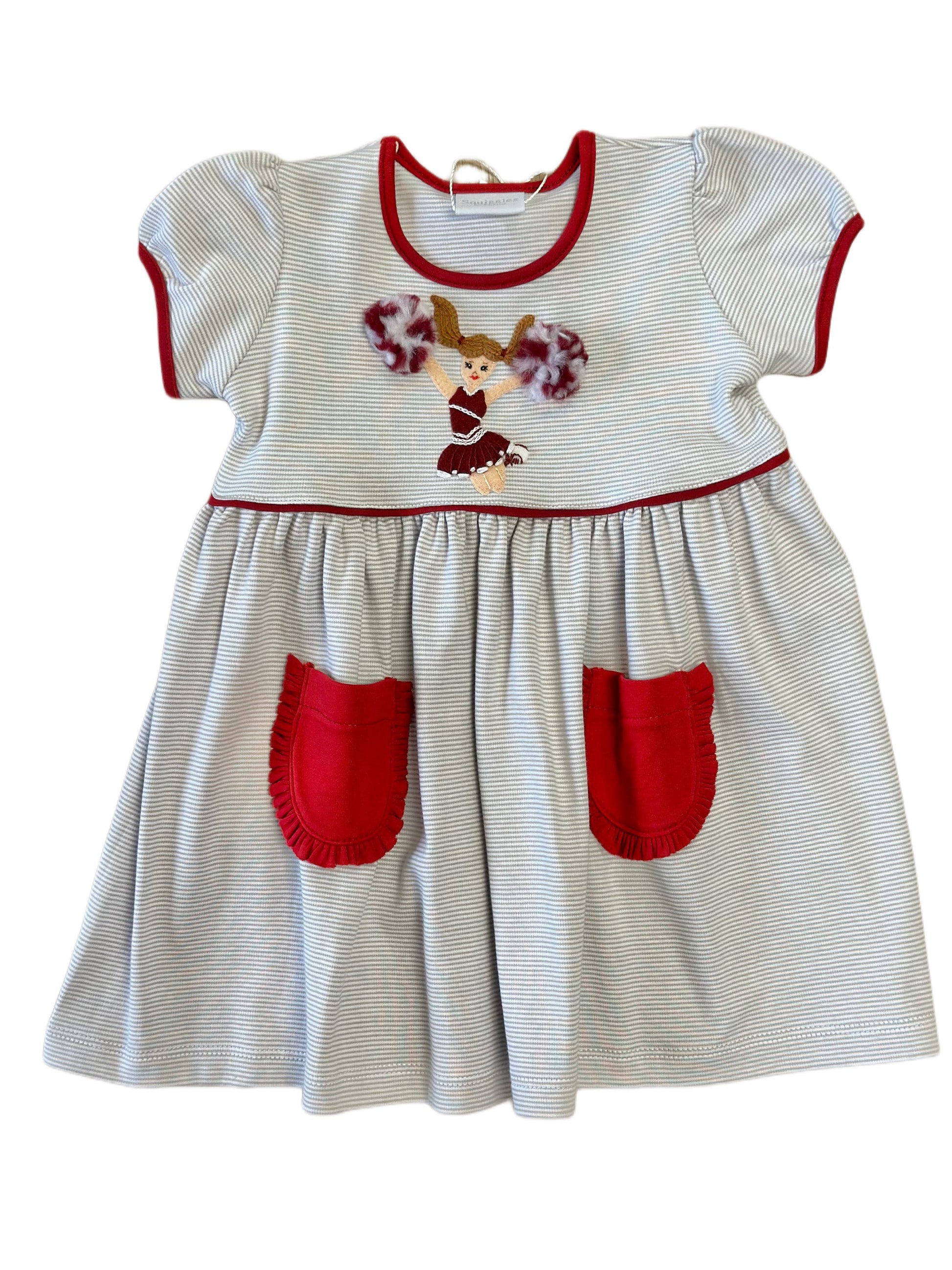 Get ready to rally for your team in style with our Cheerleader Knit Popover Dress! This short sleeve dress features a 3D embroidered cheerleader and playful poms for a fun and spirited look. The ruffle edged front pockets add an adorable touch. Show your team spirit and look cute doing it!