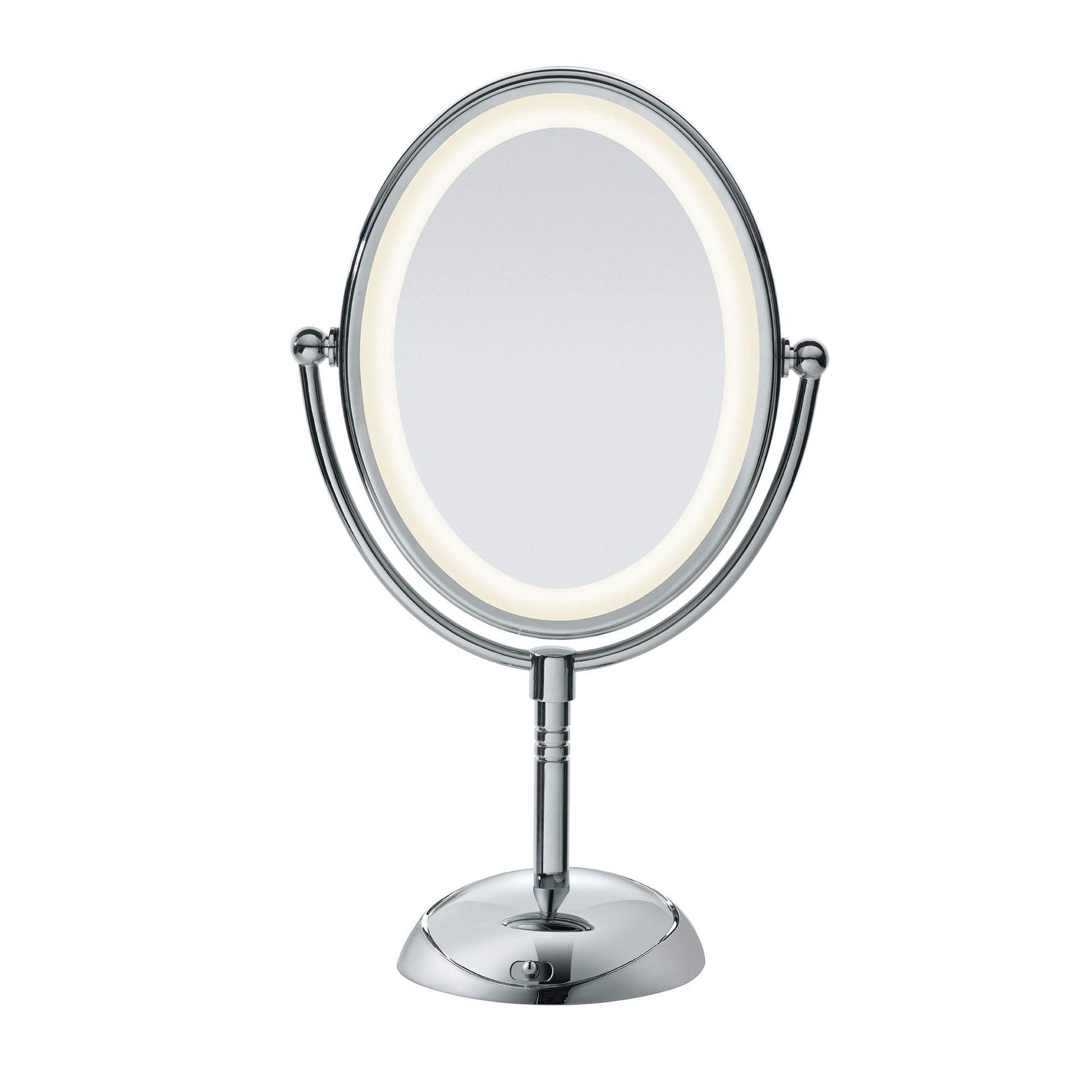 - Stylish Surroundings: This 8.5"x 6.5" oval mirror features a polished chrome finish that compliments any decor. The On/Off switch is located on the base to control settings low & high. Reflection will be distorted/inverted if not within 6" of mirror. Face Mirror Type: Lit
