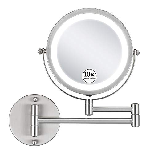 GloRiastar Cordless LED Wall Mounted Makeup Mirror with 1x/10x Magnification,Bt Powered, no Power Cord Required.360° Swivel Extendable Cosmetic Vanity Mirror for Bathroom Hotels,Brushed Nickel