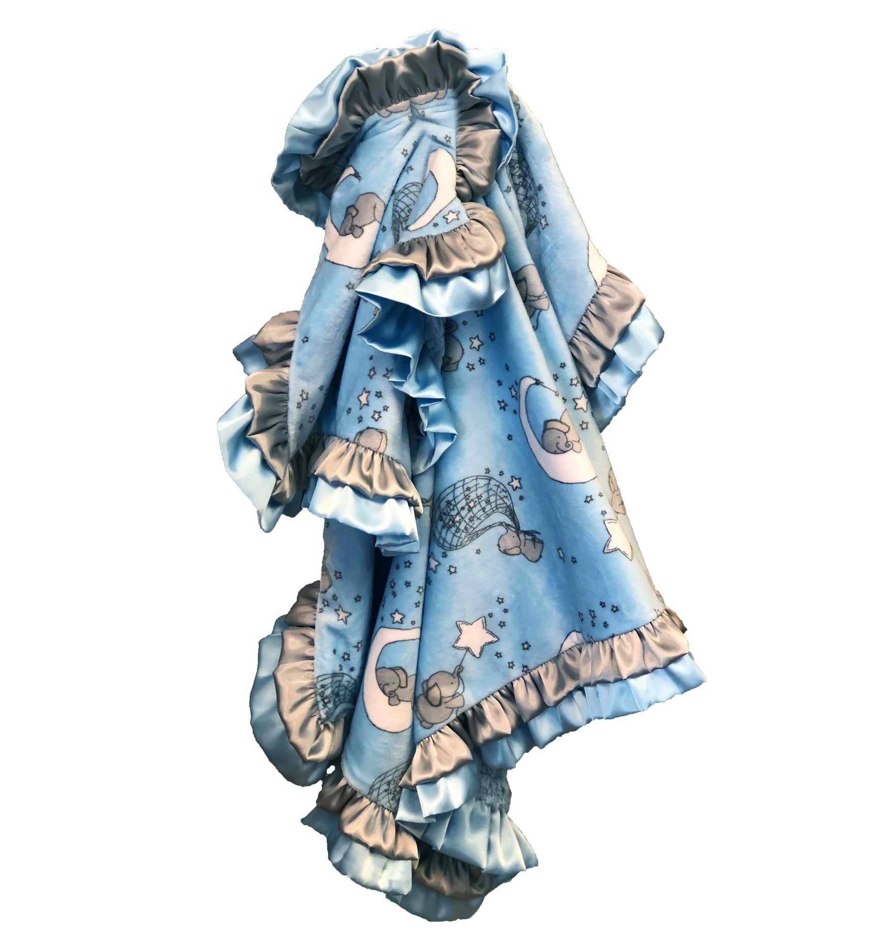 Precious Baby Blue Elephant in the Stars Pattern w/ Baby Blue Cuddle Back Side, trimmed w/ silky satin gray & blue double ruffle trim.