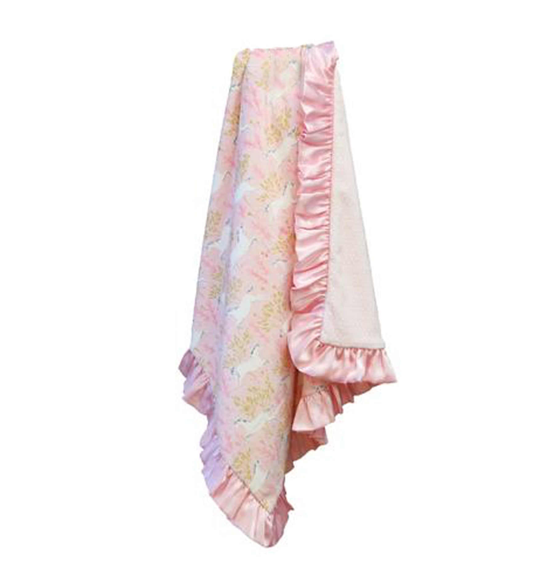 Featuring whimsical unicorns frolicking with luxurious pink & white dot cuddle on back side of blanket. Finished with a silky satin coordinating ruffle!