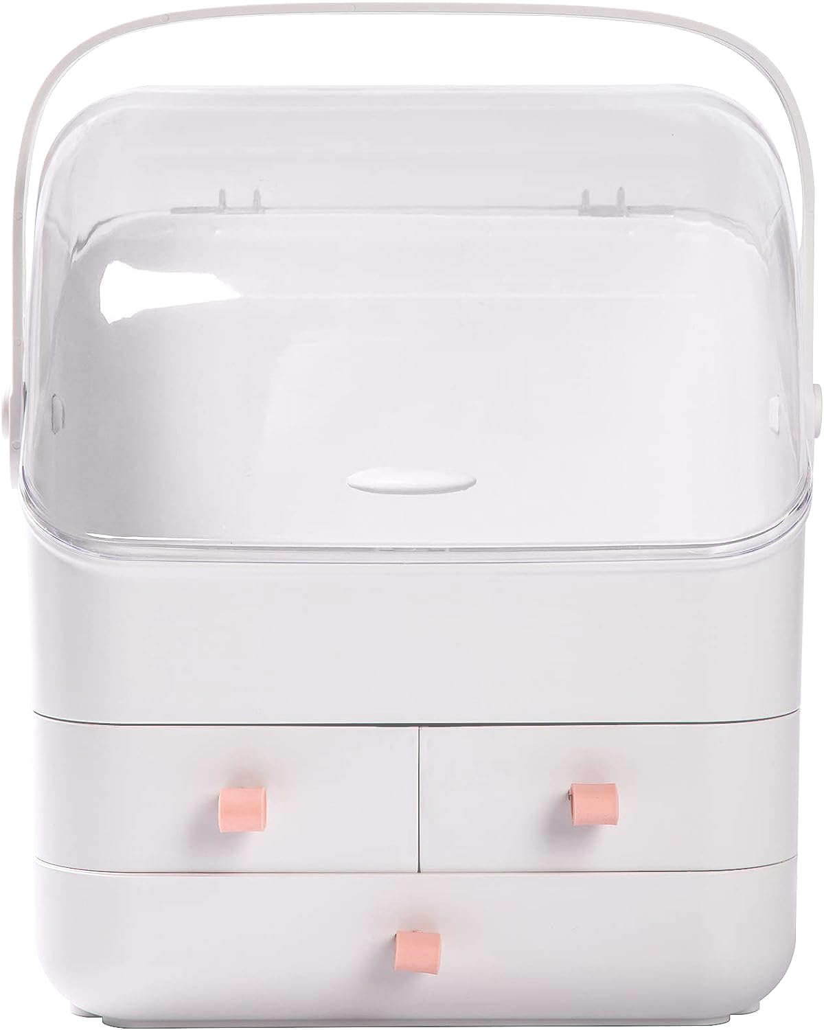 - Large Capacity Storage -- The makeup organizer box with clear lid stores your cosmetic items of different shapes and sizes while keeping them well organized.The Big top tier and 3 divided drawers can hold your jewelry,lipsticks,makeup brushes,eyeliner,eyebrow pencils,eye shadows,nail polishes,nail clippers,skincare bottles, perfume bottle, washes or other skincare cosmetics.