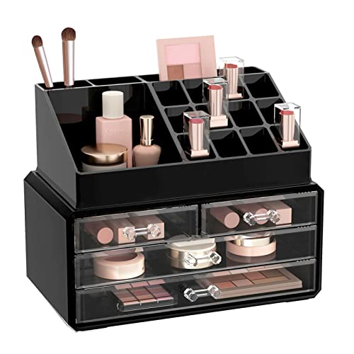 - LARGE CAPACITY: HBlife beauty organizer has 2 middle drawers, 2 small drawers, and 16 top compartments for all your grab-and-go items. Each interlocking drawer can slide out entirely without impacting the integrity of the stack. It holds at least 10 makeup brushes, 10 lipsticks, 8 nail polishes, 8 eyeliners, 3 large eye shadow palettes, and other small everyday collections to keep your vanity and bathroom counters organized.