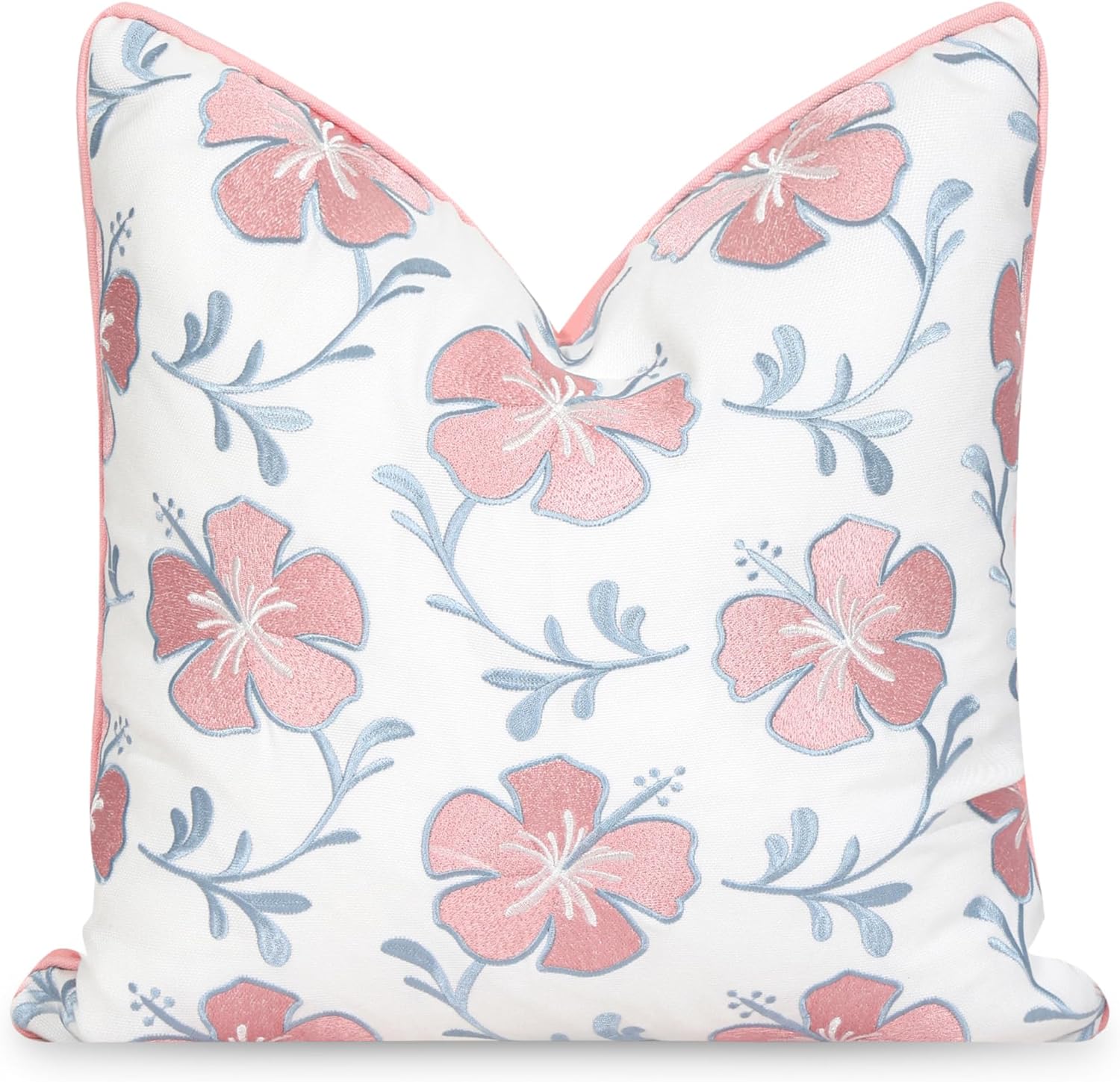 Chic Coastal Style: Featuring a hibiscus floral pattern in blush pink and baby blue over a white backdrop, this throw pillow cover creates the perfect balance of romance and sweetness for an elegant and refined style. Finished with baby blue piping. Perfect for spring, summer, fall and coastal decor.