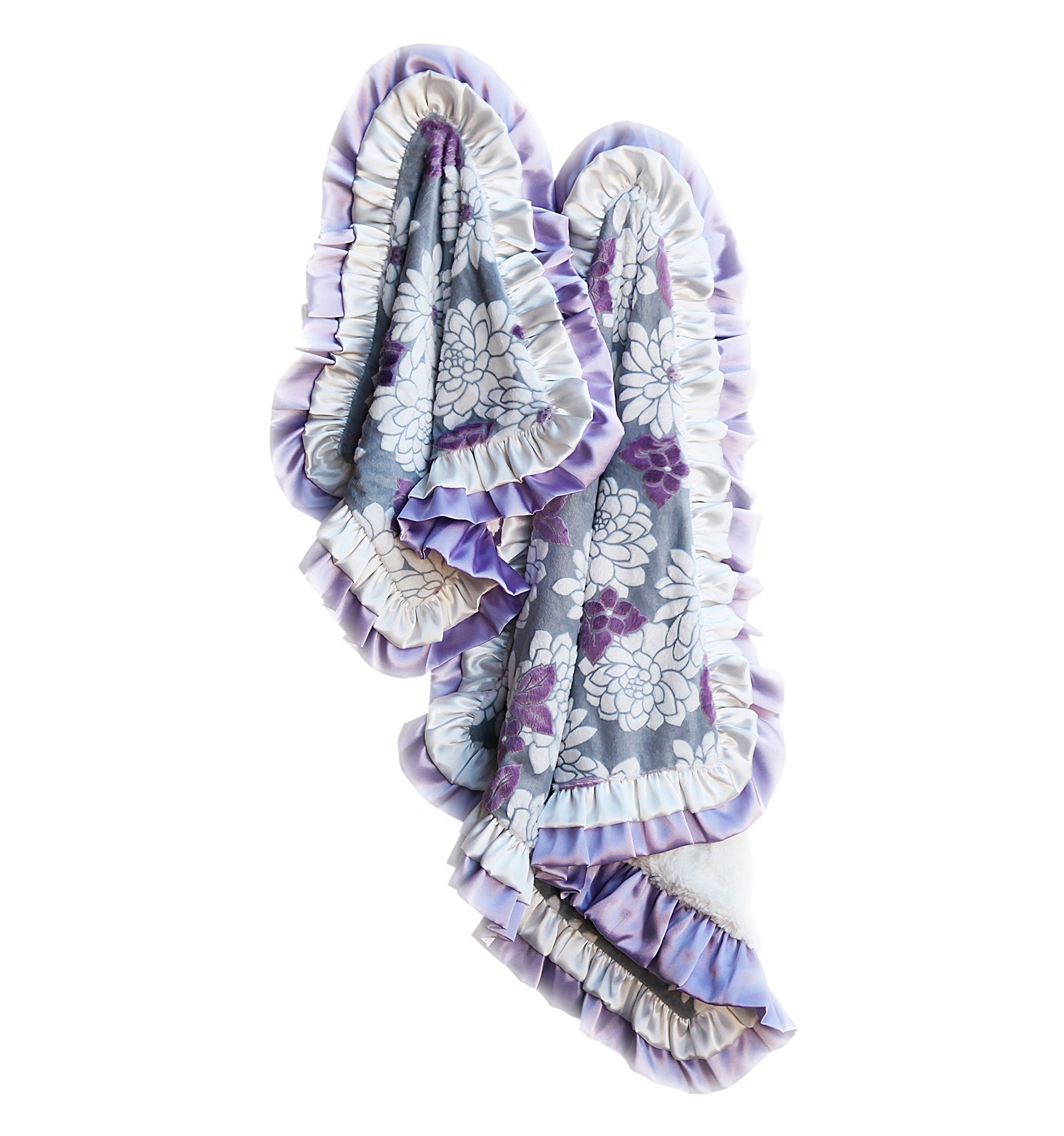 This cozy keepsake blanket features a luxurious Violet, Ivory, & Gray floral pattern w/ a lush Ivory cuddle on back side. It is trimmed w/ a coordinating Ivory & Lilac Silky Satin Ruffle.
