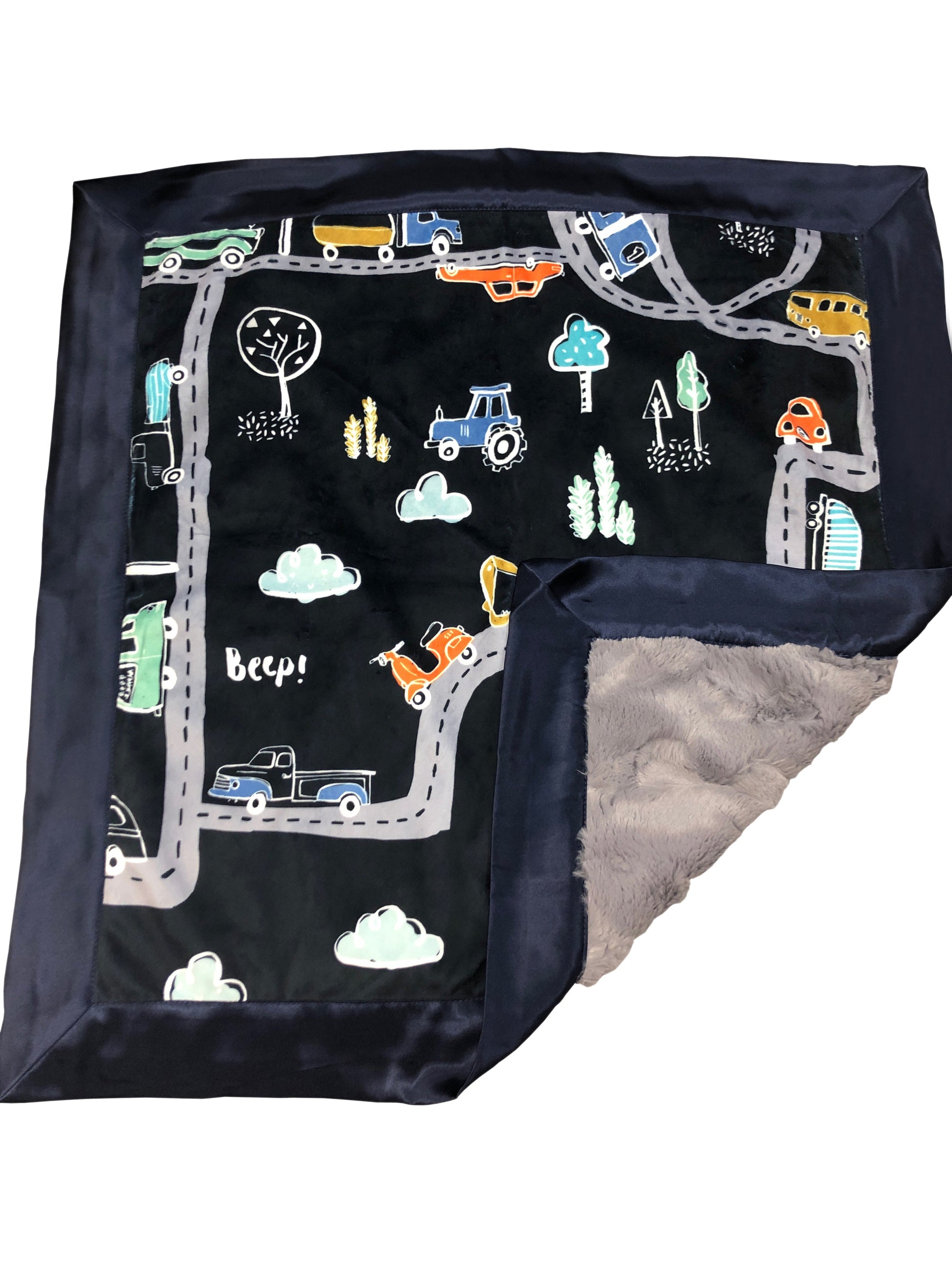 Oh So Soft & Cozy! Navy Traffic Blanket by Goochie Goo Garbs, LLC Featuring Gray Cuddle back with Silky Satin Navy Ruffle or Windowpane Trim. (Shown w/ Windowpane Trim.)