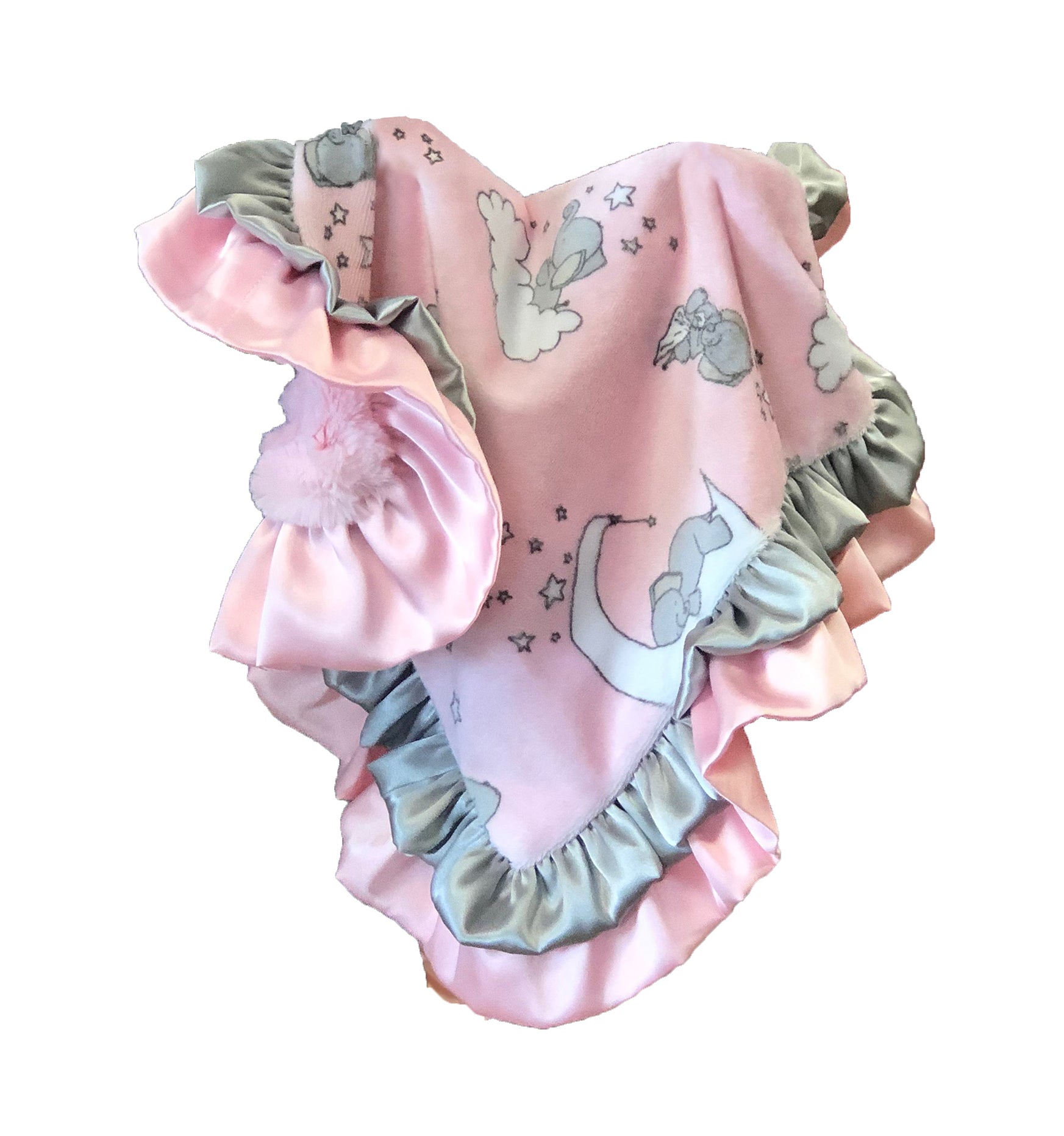 Pretty in Pink Dream Big (Elephant & Moon) Pattern w/ Lush Pink Cuddle Back Side, trimmed w/ gray & pink satin Double ruffle. 100% polyester. Hypoallergenic. Easy care (care label provided on each blanket)