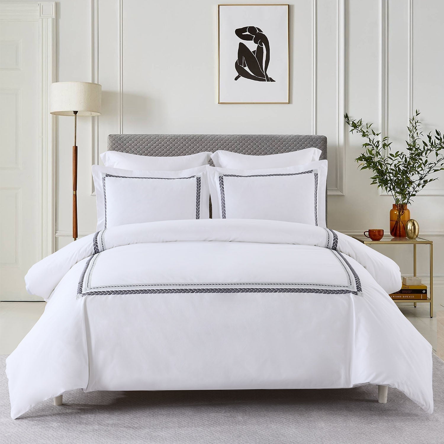 The Sadie Duvet Cover Set is adorned with laurel wreath trimming, a classic symbol of victory and success. Luxurious and alluring, it is expertly tailored with a delicate bay leaf border and Greek Key chains. Finely woven from soft 100% cotton that gets softer with each wash.