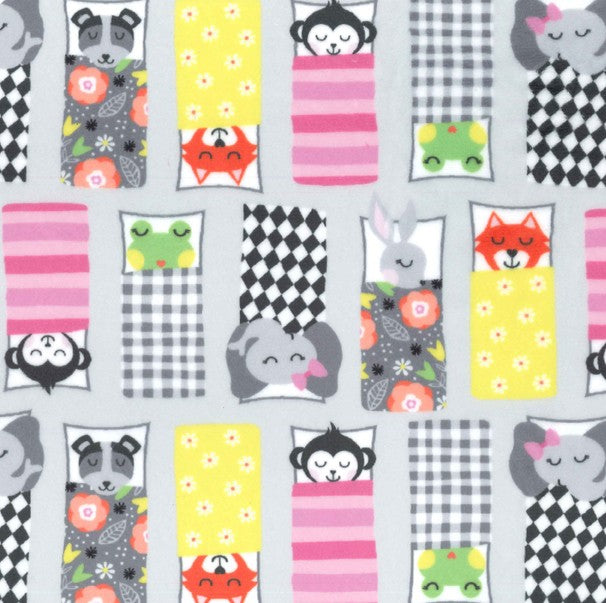 Whimsical Sleeping Bag Sleepover Hot Pink, Gray & Black print with oh so soft Hot Pink cuddle back side, finished with a Pink & Black Silky Satin Double. Ruffle Trim.