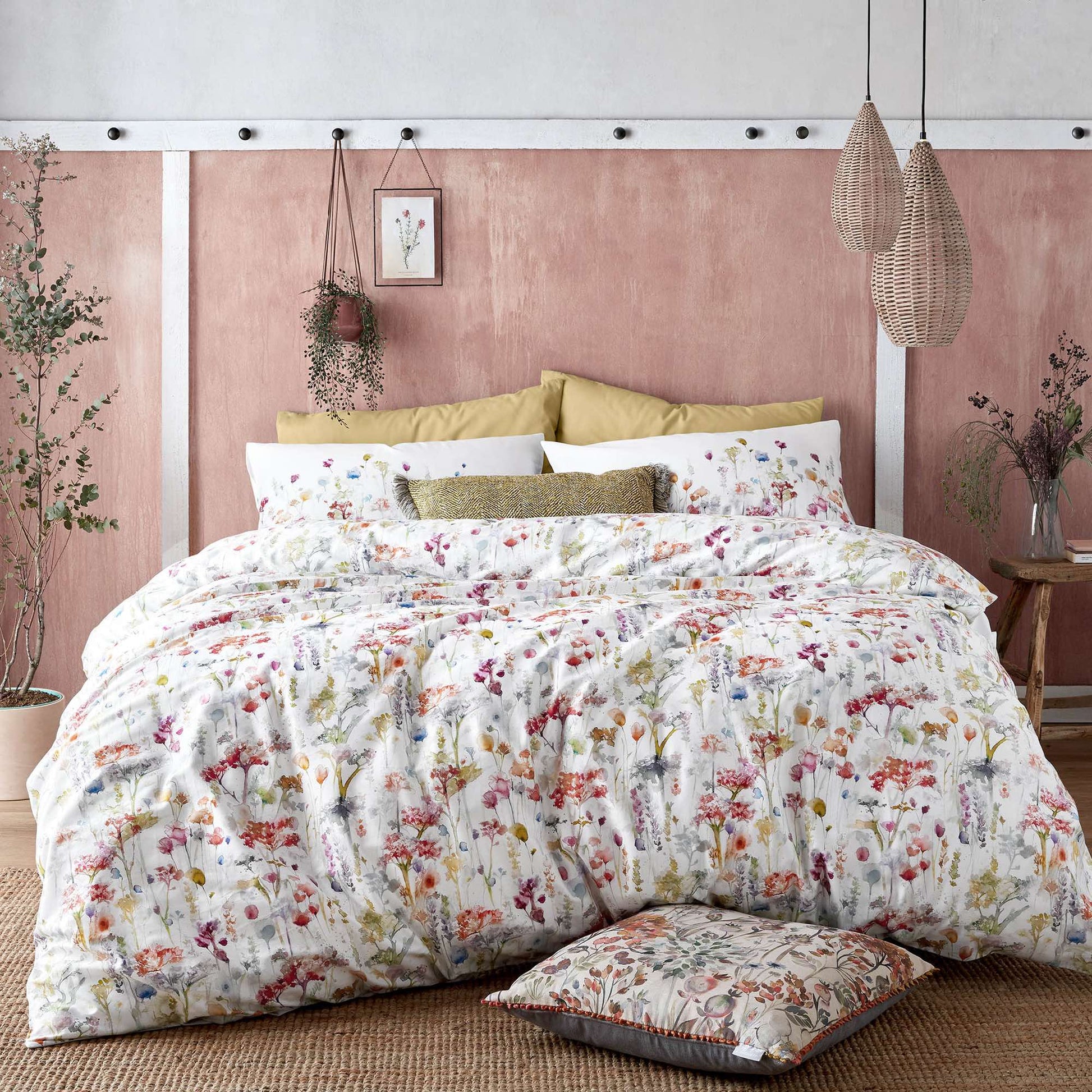 A beautiful collection of meadow flowers feature on this eye catching duvet cover, hand painted in soft tones of sage green, teal blues and rich damson with delicate splashes of water colour, printed onto a soft cream cotton cover.